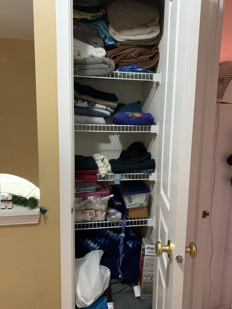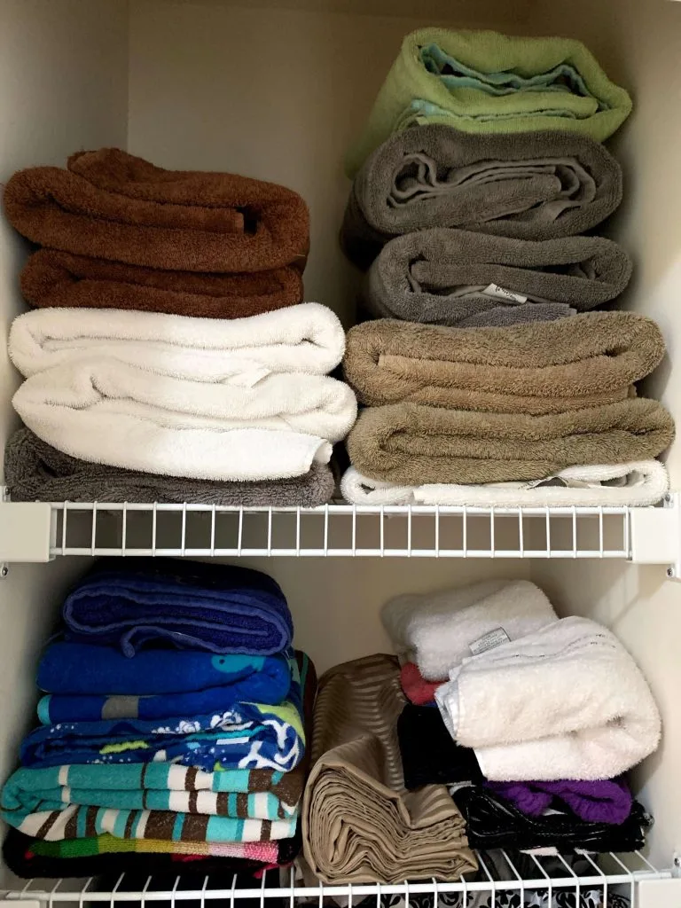 My first versions of my linen closets were a jumbled mess of linens: the ones I had as a single mom with one kid, my husband’s when we got married, and the ones we bought together, and then added a kid or two. Then from time to time, I would say it’s probably time to declutter these, or these towels are looking pretty bad, time to change them.