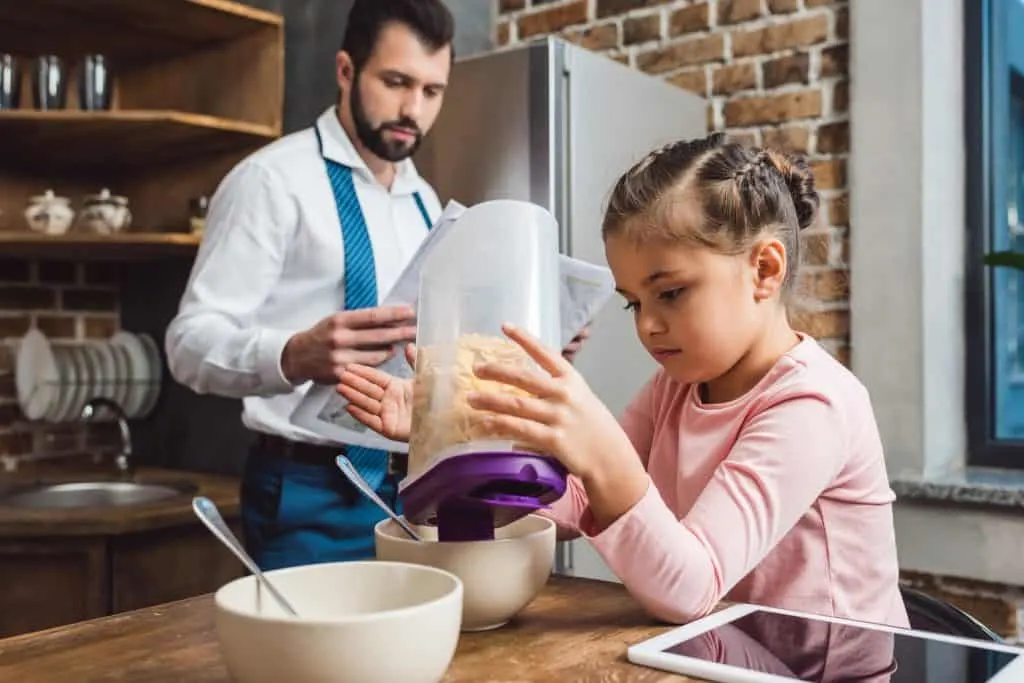 Daughter pouring cereal in bowl for father – depositphotos.com